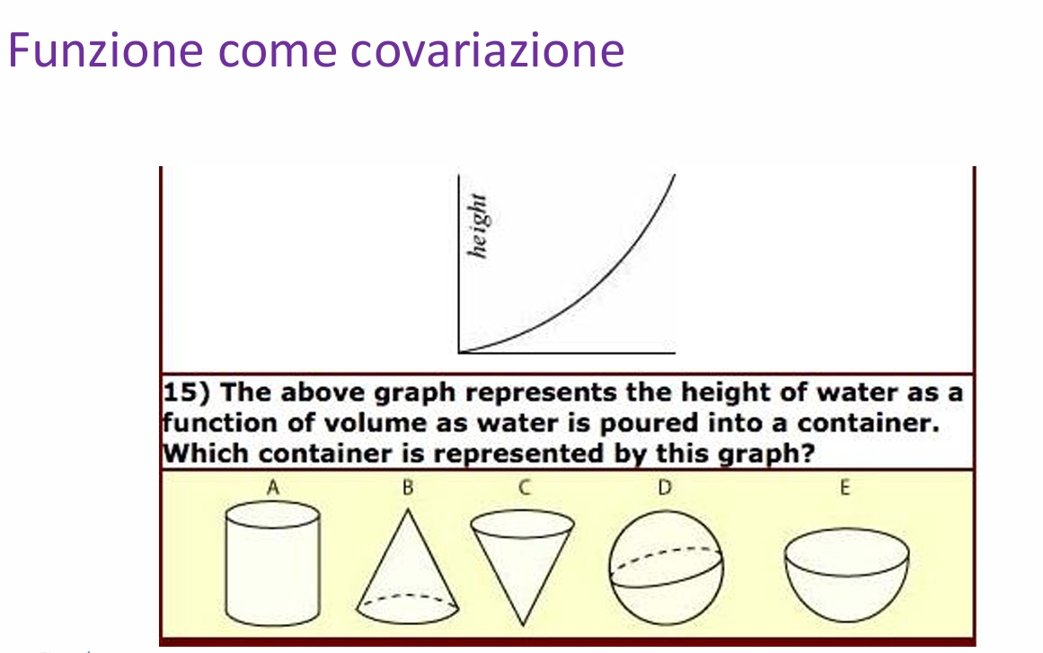Inoltre mi domando, il tipo di preparazione che si porta avanti per affrontare lo scritto finale, non è penalizzante rispetto aspetti significativi degli argomenti affrontati? Mi spiego meglio, quanto viene fuori in classe, per esempio, il tema della covariazione nello studiare le funzioni? Penso a software potenti e belli come dynagraphs (e per lo più sconosciuti in classe), che ti consentono di vedere le funzioni in maniera dinamica e di cogliere aspetti fondamentali che, inevitabilmente, non emergono nella visione statica a cui siamo abituati. E penso ai quesiti sorprendenti e stimolanti che si possono proporre adoperando questo tipo di approccio, dove non devi ricordare formule, ma aver capito veramente cos’è una funzione e descriverla nell’ottica della covariazione (vedi immagini tratte dalla presentazione della professoressa Giulia Lisarelli - Università di Pisa: Esperienze di ricerca qualitativa in didattica della matematica). Per chi voglia approfondire, consiglio questi due articoli: