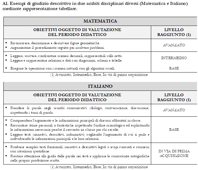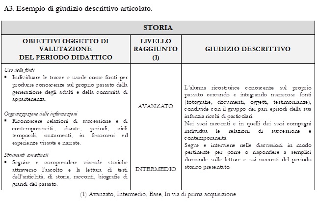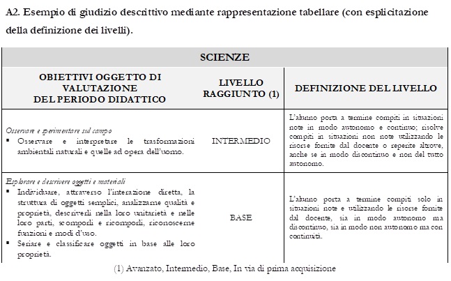 In questa prima fase di applicazione della normativa che prevede i giudizi descrittivi, i docenti selezionano gli obiettivi essenziali oggetto di valutazione, associandoli ai livelli nelle modalità che l’istituzione scolastica ritiene di adottare. Progressivamente, l’istituzione scolastica troverà modalità via via sempre più coerenti con la valutazione di tipo descrittivo delineata dalle presenti Linee guida, collegando il momento della valutazione con quello della progettazione, anche attraverso il sostegno offerto dalle iniziative predisposte dal Ministero nell’ambito del piano triennale di formazione dei docenti.
