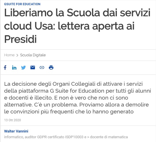 Insomma, ciascuno di noi è libero, purché consapevole, di utilizzare servizi che lo rendono di fatto asservito alle logiche, agli interessi e ai profitti delle piattaforme proprietarie, ma la scuola pubblica non può e non deve permetterselo.