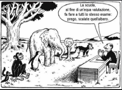 A seguire, Loredana Leoni, con un intervento dal titolo di per sé già significativo: “Valutazione e voto: come, quando e perché”. Non ce ne voglia, Loredana Leoni, ma il suo intervento è iniziato con la nota vignetta degli animali assai diversi, cui viene chiesto – in nome di un’equità apparente - di arrampicarsi su un albero per essere valutati, ed è poi proseguito con la relatrice che si arrampicava sugli specchi per dimostrare che i voti e le pagelle sono conciliabili con la valutazione formativa - oltre che con la certificazione delle competenze- e che, in fondo, il Dlgs 62/2017 sarebbe una “occasione persa”.